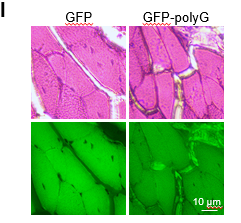 過表達poly-G蛋白導致小鼠肌肉出現邊緣液泡。對P1小鼠的肌肉注射AAV-GFP與AAV-GFP-poly-G病毒,三個月后對小鼠的肌肉進行H&E染色,紅色為明場圖像,綠色為熒光拍攝圖像。圖像均由明美倒置熒光顯微鏡采集。