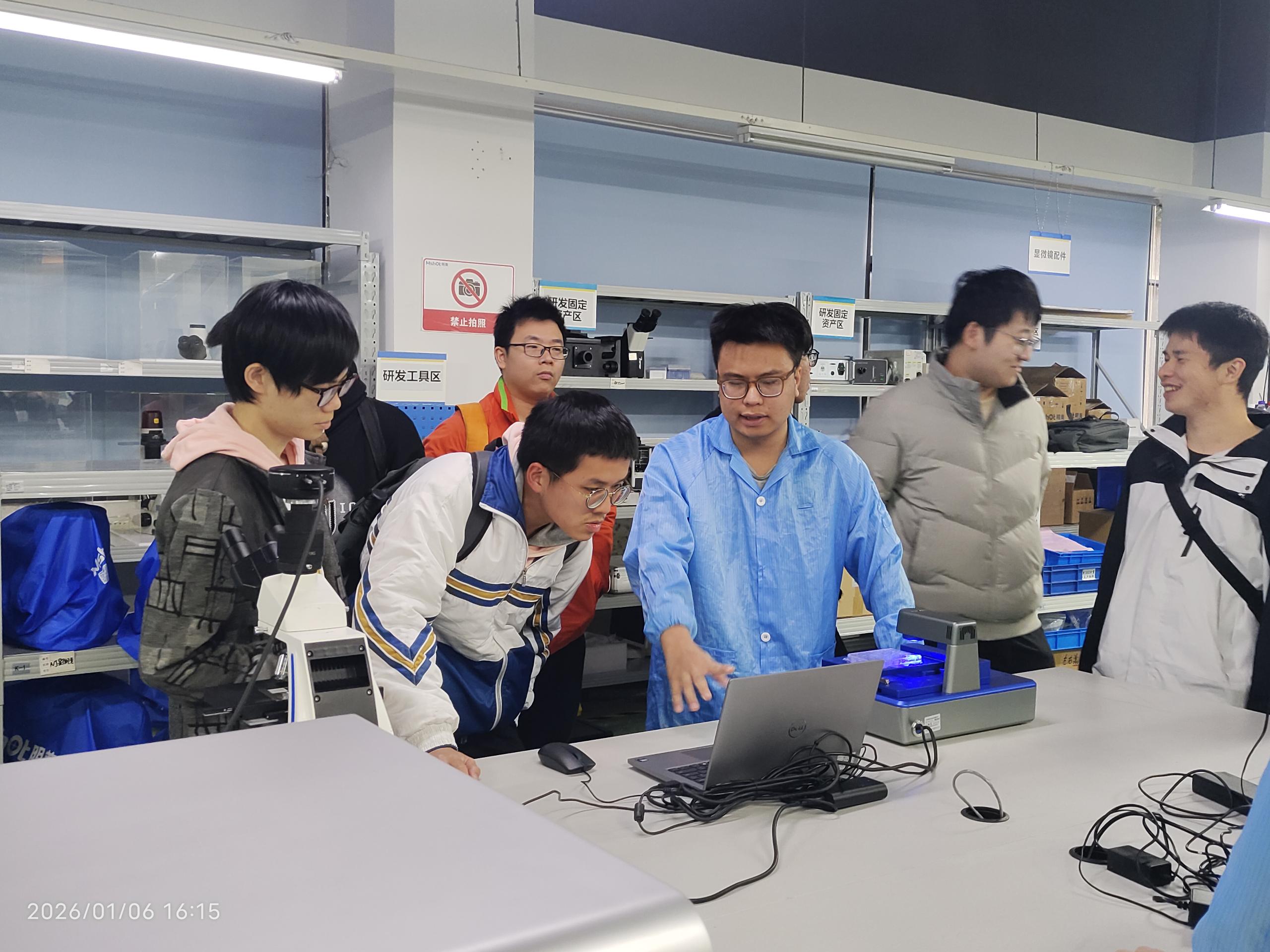 理論環節結束后,同學們分組進入公司核心區域進行實地參觀。本次參觀路線涵蓋研發小試區、工程中試區、生產組裝區和產品檢驗區,生產部經理周安教、技術部工程師李驍凡等參與了接待講解,為同學們介紹了公司活細胞掃描分析儀MCS31、生物顯微鏡ML45等重點產品。