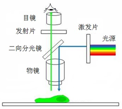 熒光顯微鏡的主要原理是:光源的光經過激發片的過濾,得到激發光;激發光照射到樣品上,樣品受激發而發射出熒光;二向分光鏡可以同時反射激發光,和透射熒光。