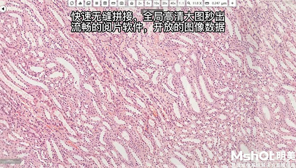 掃描完畢后,數字切片掃描系統整合的高性能電腦能快速無縫拼接輸出全局高清大圖,閱片軟件運行穩定流暢,并且由于圖像數據采用了開放的格式,用戶后期可以很方便地進行各種科學研究和計算。
