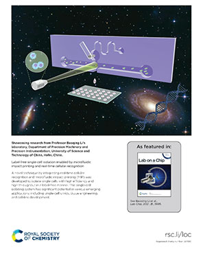 該成果以“Label-free single-cell isolation enabled by microfluidic impact printing and real-time cellular recognition”為題,發表在工程技術領域期刊《Lab on a Chip》(2021,21,3695–3706),并入選當期封底 (Back Cover)。中國科學技術大學工程科學學院博士生王一鳴為本論文的作者,李保慶副教授為該論文的通訊作者。這項工作得到了中科院先導專項(XDC07040200),國家自然科學基金(51929501)支持。