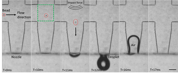 該技術采用高速相機實時捕捉采集檢測區域的圖像,利用計算機對圖像進行實時處理,以識別單個細胞,然后向信號控制模塊發送觸發信號,觸發壓電致動器撞擊打印室上的柔性薄膜,從噴嘴處產生一個包含單個細胞的液滴,并結合位移臺運動形成單細胞液滴陣列。