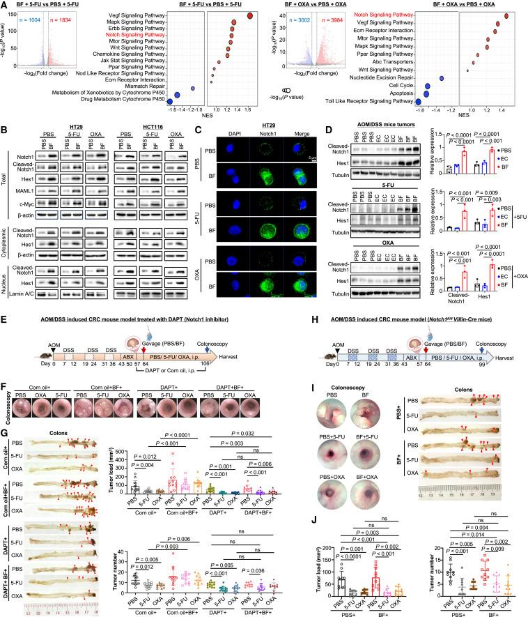 為了解BF驅動藥物抗性的分子機制,通過GSEA分析,發現BF介導Notch信號通路可能為化療耐藥的核心通路;經BF處理后的HT29和HCT116中Notch1 的胞內活性片段(NICD1)、Notch1 總蛋白及下游靶基因(Hes1、c-Myc)的表達水平顯著升高,說明BF 確實激活了 Notch 信號通路,并抑制了化療誘導的凋亡。免疫熒光染色顯示,在HT29細胞中Notch1活化(圖3C)。