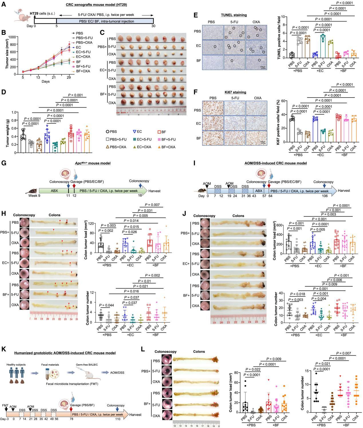 HT29異種移植至裸鼠后經5-FU/OXA處理后,BF、大腸桿菌或PBS每兩周進行一次腫瘤內給藥(圖2A);大腸桿菌和PBS組中,5-FU抑制了腫瘤生長,而 BF則削弱了這些作用(圖2B-D);通過TUNEL檢測細胞凋亡,其中BF + 化療組的細胞凋亡(TUNEL 陽性)比例遠低于 PBS/EC + 化療組。