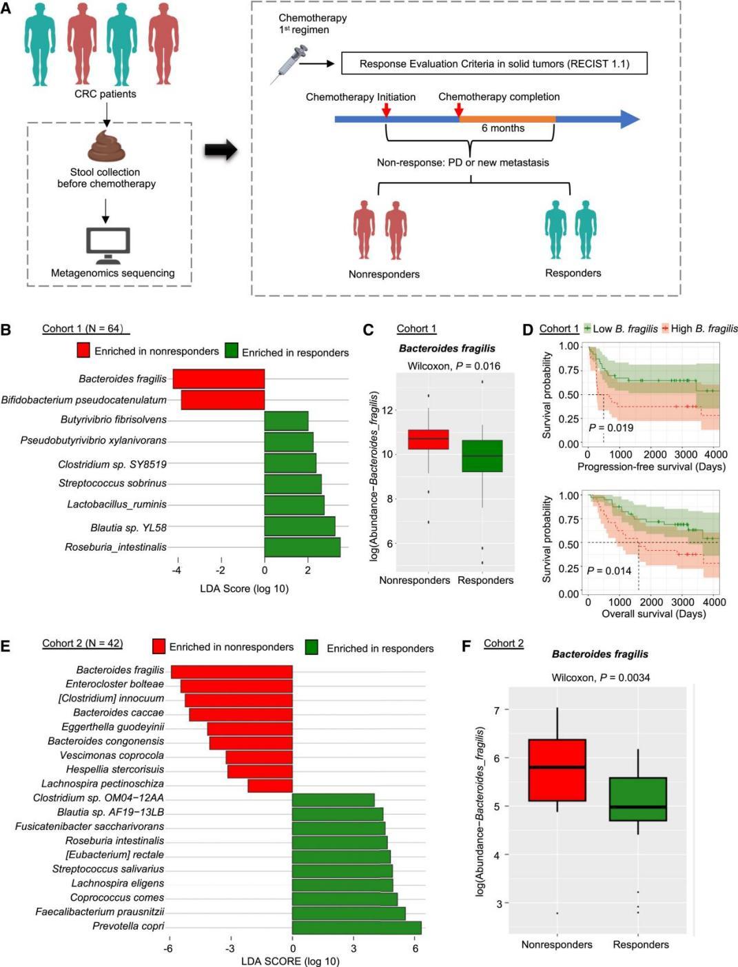 以6個月為觀察期,將結腸癌患者(CRC)分為應答者和無應答者,化療前糞便收集,進行宏基因組測序分析菌群組成(圖1A);LEfSe 分析篩選差異特征菌(圖1B&E);BF豐度與患者生存的關系(圖1D&F)。結果:BF是化療無反應的獨立預測因子,BF可能是導致結直腸癌化療耐藥的影響因素。