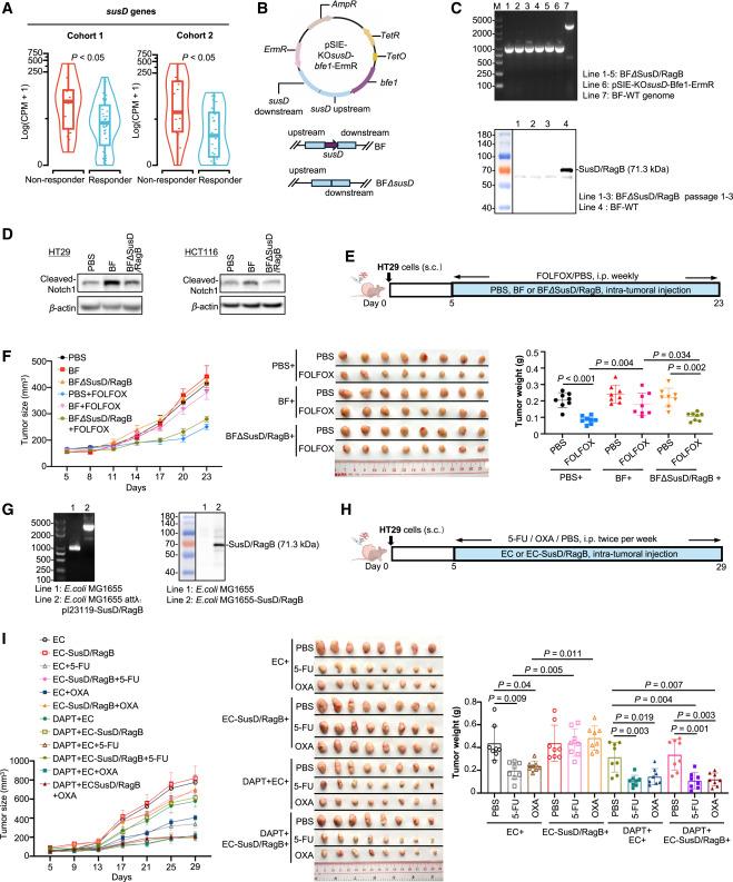 為進一步驗證SusD/RagB在脆性芽孢桿菌介導的化學耐藥中的重要性,研究人員構建了SusD/RagB缺失的 BF(B. fragilisΔSusD/RagB)(見圖5B和5C),未能誘導Notch1激活(見圖5D)及在CRC細胞(圖S7J)和HT29異種移植中出現化學耐藥(見圖5E和5F)。還構建了大腸桿菌MG1655,SusD/RagB(大腸桿菌SusD/RagB)(見圖5G)。大腸桿菌SusD/RagB導致HT29異種移植中的化學耐藥性(見圖5H和5I),該效應被DAPT消除,證實SusD/RagB對脆弱擬桿菌的化學耐藥作用至關重要。