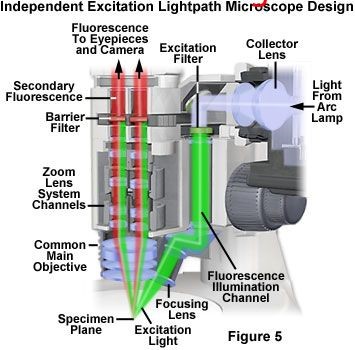 其他顯微鏡制造商有著不同的提示熒光照明設計,如Figure5中為比較主流的模式之一。在這一設計中,有一個獨立于成像光路的熒光照明通道。由光源發出的光首先經過激發光濾色片,然后通過主機后方的通道到達底部的透鏡組,這些透鏡組將光傳導到樣品上。這樣的設計保證了無論在何種放大倍數下,激發光都會直接照射在樣品上,范圍,發射光強度,黑背景都不隨放大倍數改變。發射出的熒光通過物鏡到達變倍體后,透過發射光濾光片,進入目鏡用于觀察或進入相機。這一設計主要的優勢在于取消了半透半反鏡,并且濾片的組合可變,研究者可選的范圍很大。然而,這也帶來了相應的問題,如,沒有經驗的操作者可能會因為選擇了錯誤濾片組合而觀察不到熒光。