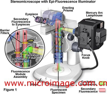 由光源發出的光經過匯聚透鏡到達濾色塊組中的激發光濾光片,在這里,光源中的光只有一部分(某段特定的波長)能夠通過濾片。透過濾片的光被半透半反鏡反射,經過機身下部的變倍體透鏡組,物鏡,到達樣品。半透半反鏡的具有反射小于特定波長的光,而使大于特定波長的光透過的特性。