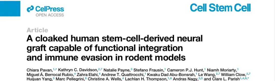 本文配圖均來源于:Chiara Pavan 等. A cloaked human stem-cell-derived neural graft capable of functional integration and immune evasion in rodent models. Cell Stem Cell, 2025, 32 (5): 710-726.e8. DOI: 10.1016/j.stem.2025.03.008