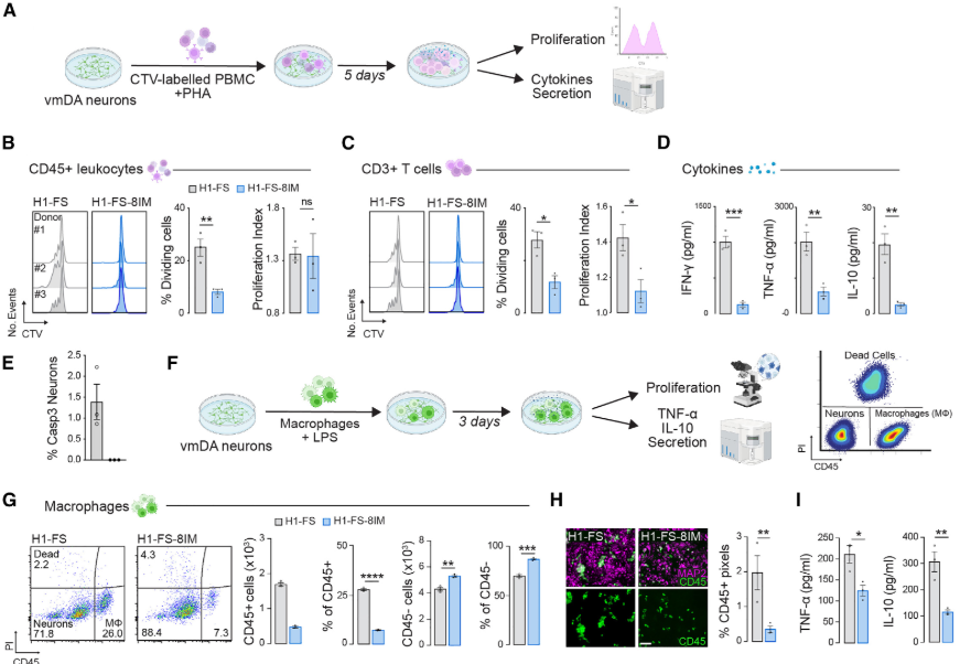 以及通過免疫熒光實驗(圖2H-L)進行定量統計:神經元(品紅)無差異,但H1-FS-8IM中CD45+巨噬細胞(綠色)較H1-FS共培養減少,證明H1-FS-8I在體外表現出能夠逃避多種參與移植物排斥的免疫細胞群的能力(圖2)。