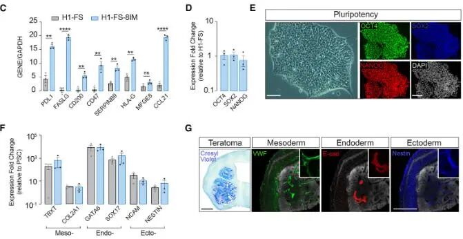 第一輪用 PiggyBac 轉座子插入 4 個基因并經嘌呤霉素篩選;第二輪用 SleepingBeauty 轉座子插入剩余 4 個基因并帶熒光報告基因,構建 H1FS8IM 細胞系,引入 HSVTK 自殺基因(與 CDK1 轉錄關聯)。通過qPCR、免疫熒光實驗等驗證H1-FS-8IM 細胞經基因編輯后其多能性、三胚層分化能力無顯著變化,是具備正常分化潛能的多能干細胞(圖1)。