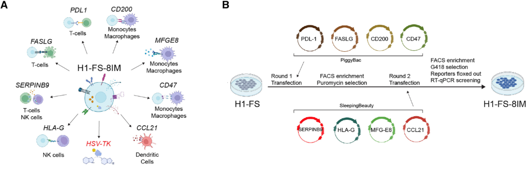 本研究模擬胎盤和癌細胞的免疫逃逸機制,分兩輪用不同轉座子系統將 8 種免疫調節基因(PDL1、CD200、CD47、HLAG、FASLG、SERPINB9、CCL21、MFGE8)轉入 H1 人多能干細胞(hPSC):