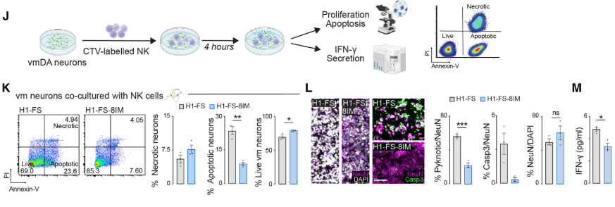 隨后研究人員利用GCV處理DIV13 vmDA 神經元及DIV13 vmDA 神經元與免疫細胞共培養體系,通過免疫熒光染色及細胞流式分析發現,H1-FS-8IM細胞中激活自殺系統的同時對其免疫逃逸作用沒有顯著影響(圖4A-D)。