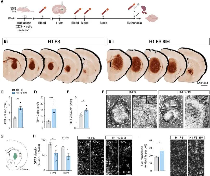 核心結論:H1-FS-8IM 神經移植物在體內可長期存活、高效分化為多巴胺能神經元,同時減少炎癥反應并實現功能整合,驗證了其作為細胞治療產品的體內有效性。