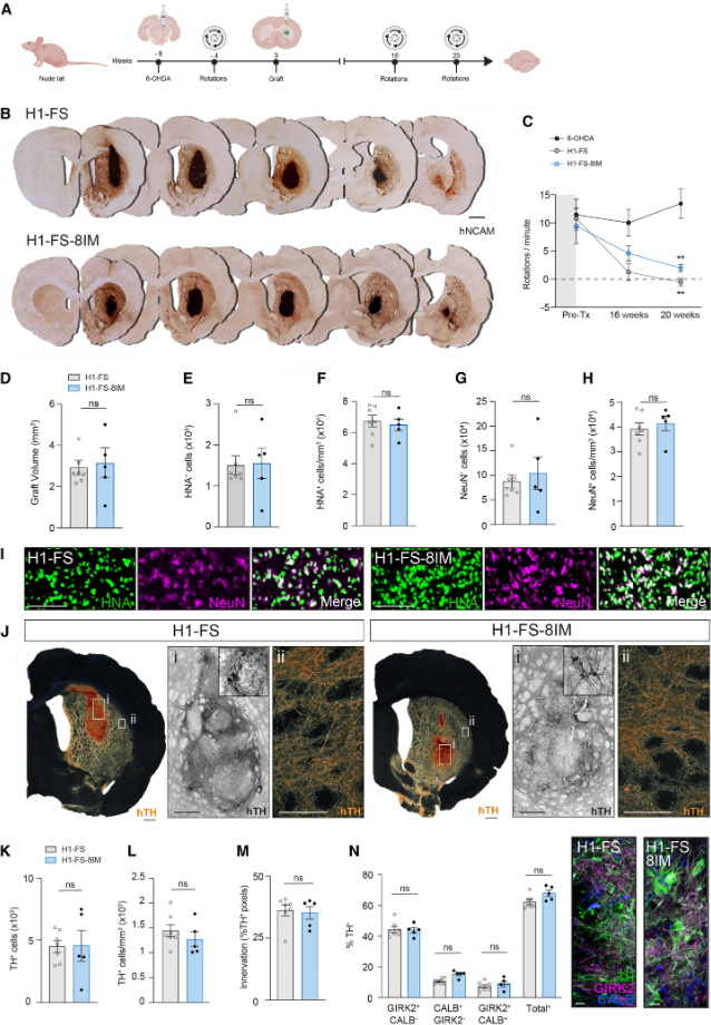 最后為了評估H1-FS-8IM細胞對帕金森疾病的實際效用,研究人員通過采用 6-OHDA 誘導裸鼠構建帕金森模型(損傷多巴胺能神經元),隨后移植 H1-FS 或 H1-FS-8IM 移植物,長期追蹤其治療效果。