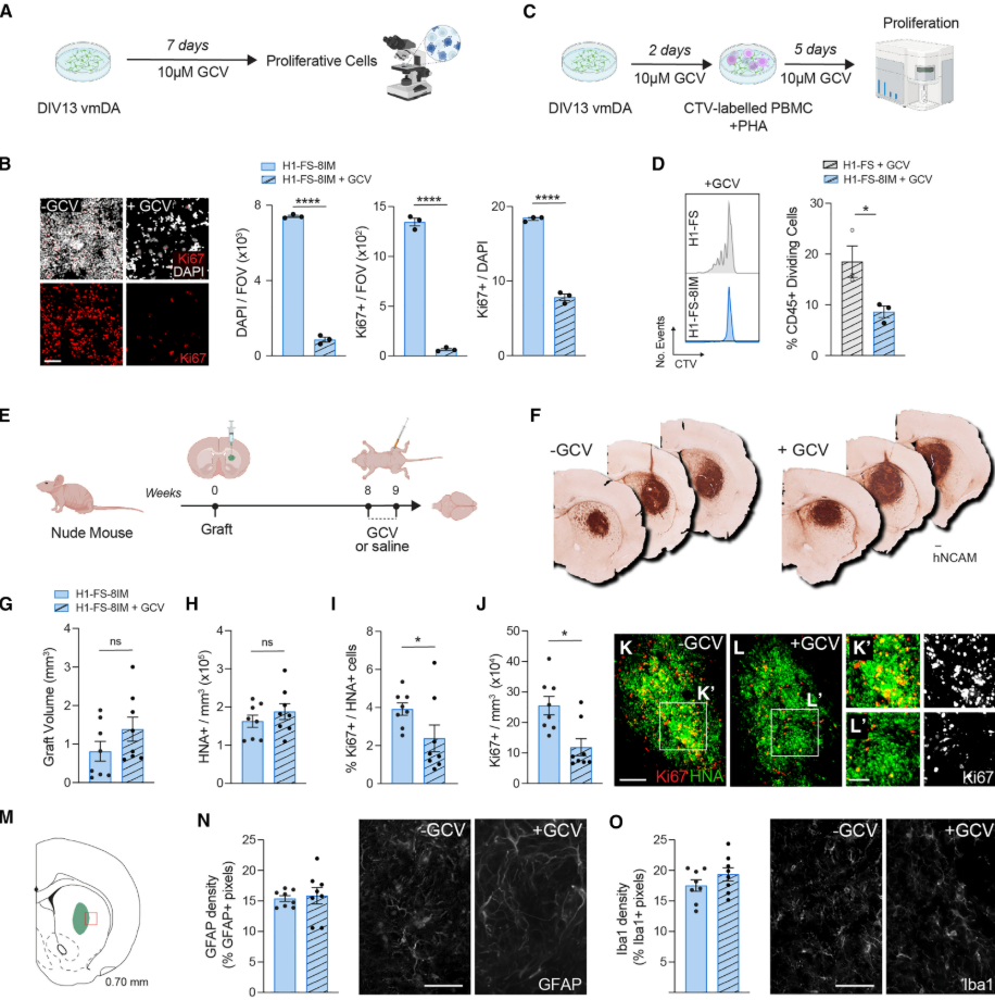 以免疫缺陷裸鼠為模型,驗證更昔洛韋(GCV)對 H1-FS-8IM 神經移植物的安全管控作用:GCV 處理組的H1-FS-8IM 神經移植物在顯著清楚異常增殖細胞的同時,不損傷其包括移植物體積、移植物細胞密度、神經元分化狀態及體內微環境等正常功能(圖4E-O),為該細胞的臨床安全應用提供了體內證據。