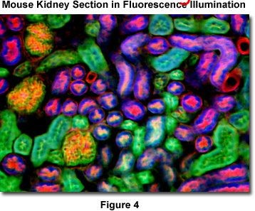 以Nikon SMZ1500為例,這款體視鏡的放大倍數為4x到540x,接近一臺復合式顯微鏡的放大倍數。研究者可以通過這樣的體視鏡觀察大體積的活樣品,或經熒光標記的薄切片。Figure4為三色熒光染色的小鼠腎臟切片。使用的染料分別為DAPI, Alexa Fluor 488 WGA, 及 Alexa Fluor 568,相應的濾色片為Table1中的Blue GFP/DAPI, Endow GFP Bandpass, 及 TRITC DsRed。這張圖片體現了體視鏡具備了觀察復合式顯微鏡樣品的能力。